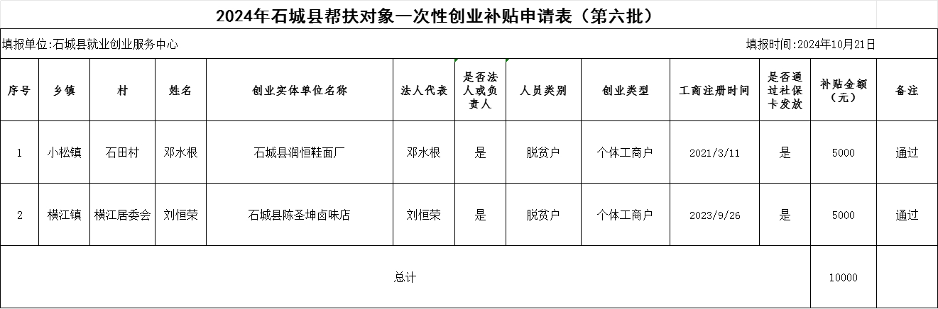 石城縣2024年幫扶對象一次性創(chuàng)業(yè)補貼撥付公示表(第六批)
