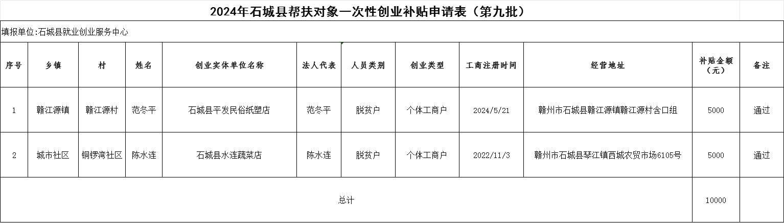 石城縣2024年幫扶對(duì)象一次性創(chuàng)業(yè)補(bǔ)貼撥付公示表(第九批)