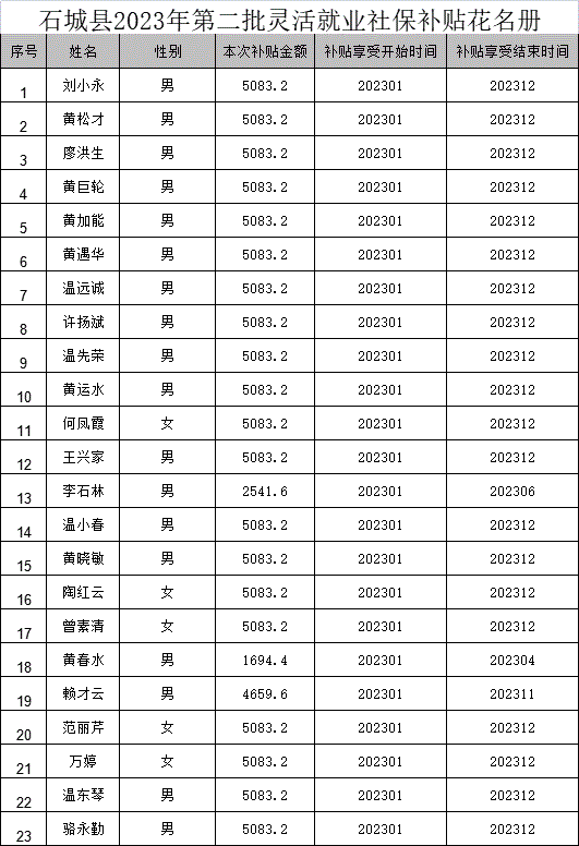 根據贛財社﹝2019﹞1號文件,現將2023年第二批“4050”就業困難人員靈活就業社保補貼資金擬撥付予以公示,公示期為7天,公示時間為:2023年6月30日-2023年7月6日,如有異議,請于公示期內向石城縣就業創業服務中心提出意見。