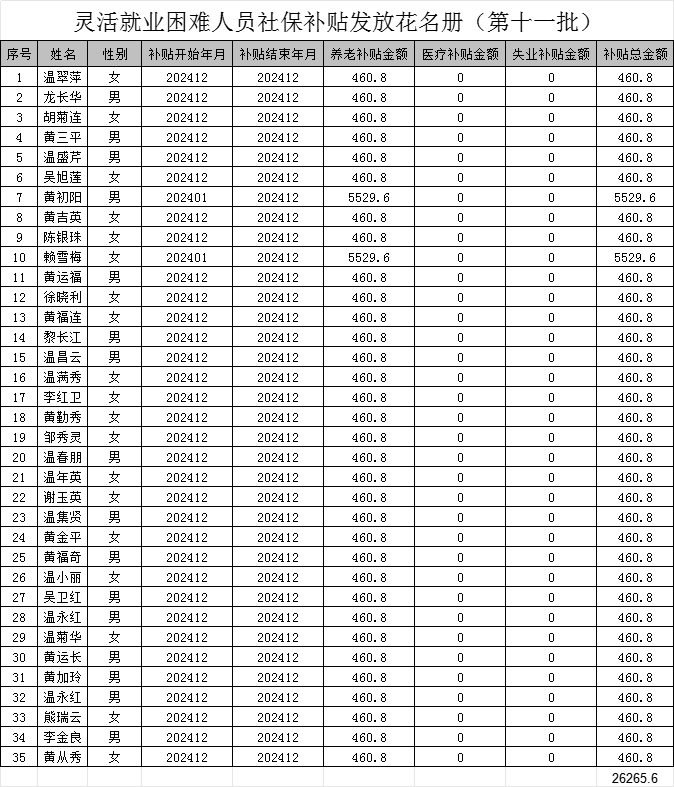 石城縣就業困難人員社保補貼2024年第十一批撥付公示表