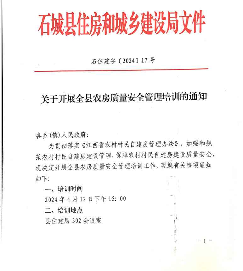 關于開展全縣農房質量安全管理培訓的通知
