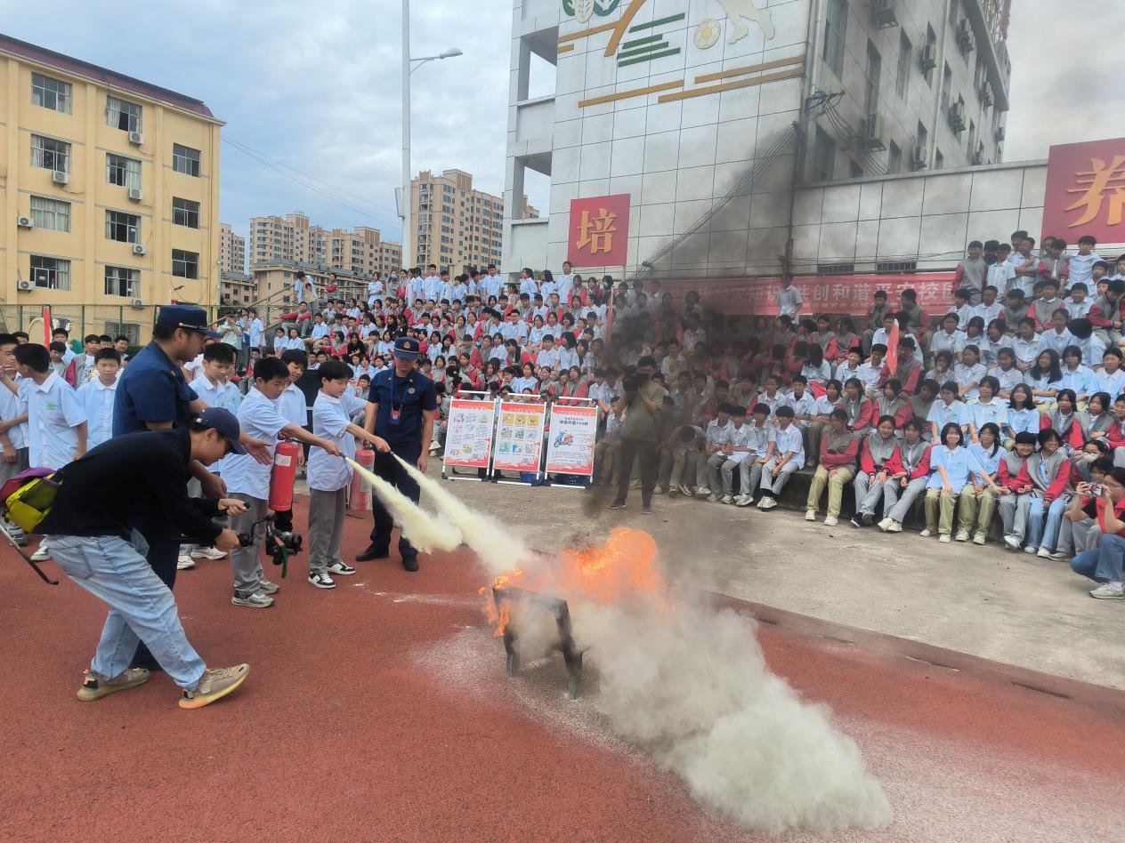 “一提、二搖、三拔、四瞄準(zhǔn)、五噴……”消防人員現(xiàn)場(chǎng)為學(xué)生們演示滅火器滅火。