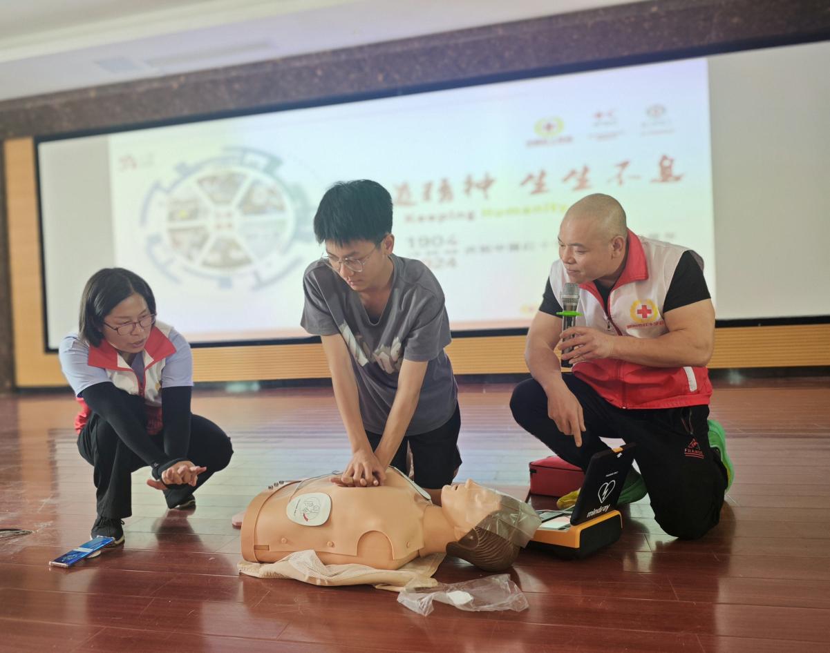 緊急救護(hù),胸外按壓……現(xiàn)場(chǎng),紅十字會(huì)相關(guān)工作人員向?qū)W生們講解示范胸外心臟按壓、人工呼吸、按壓深度等操作要領(lǐng)。